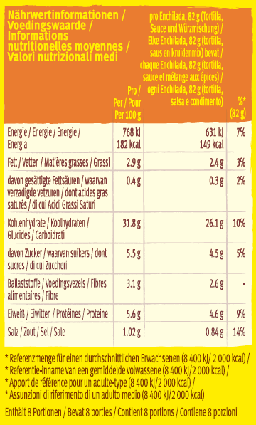 Enthält: 8 Weiche Maismehl-Tortillas (335 g), 1 Beutel Enchilada Würzmischung (22 g), 1 Beutel Tomatensauce (300 g)