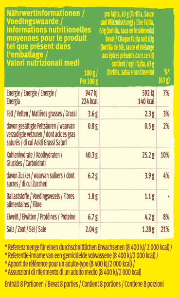 Contient: 8 tortillas de blé souples (326 g), 1 sachet d’épices pour Fajita (30 g), 1 sachet de Salsa Original Mild (144 g)